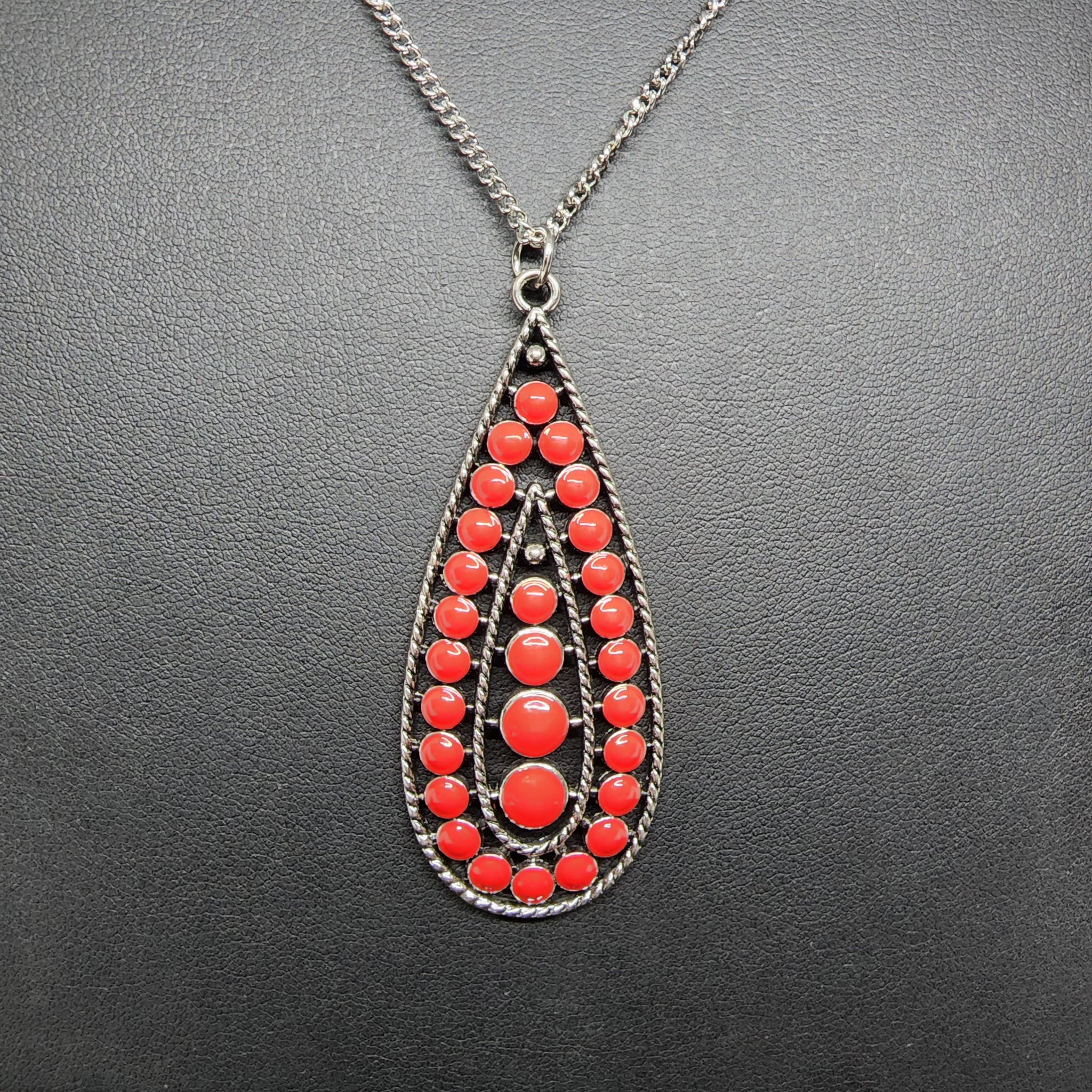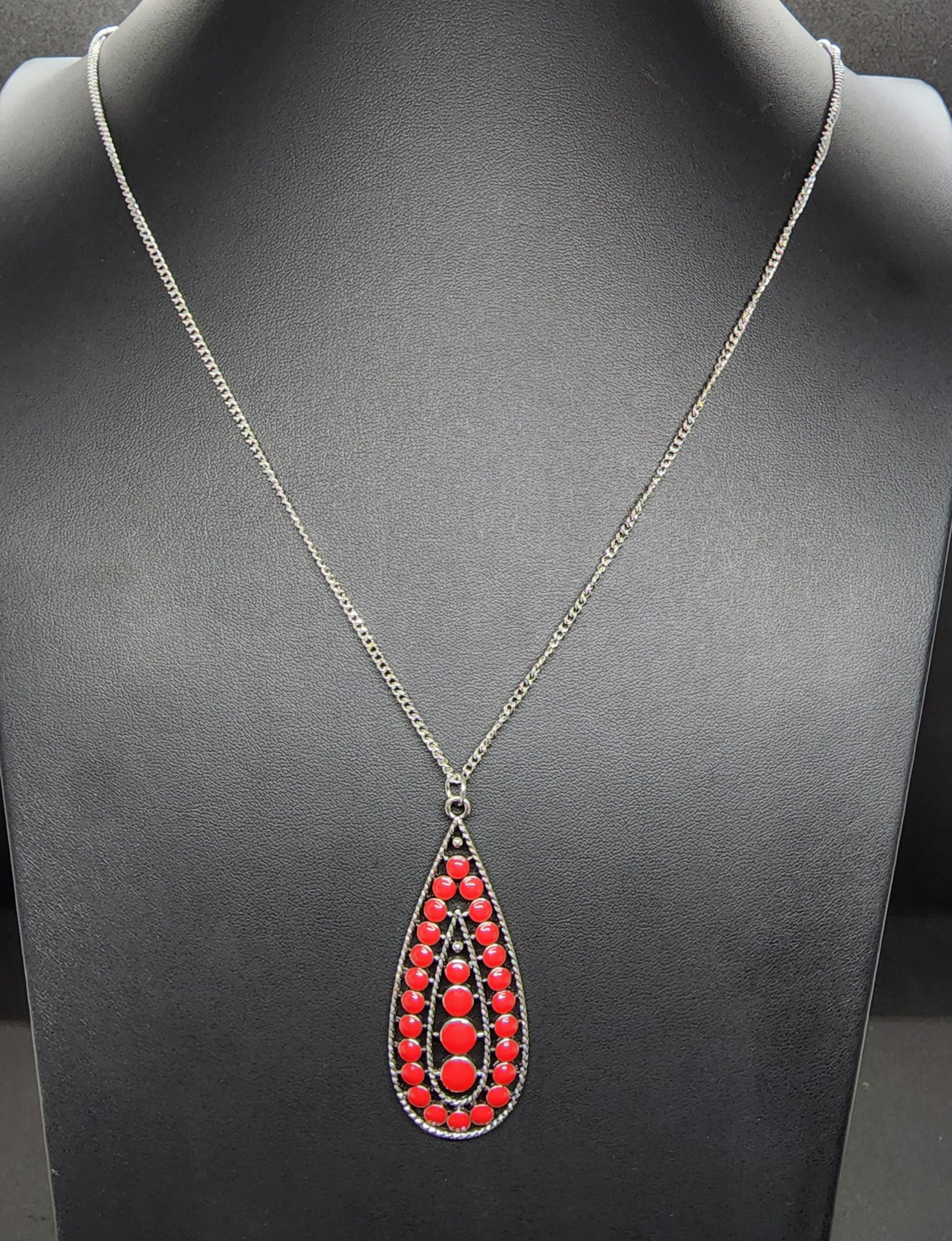 Long silver necklace with red accents.