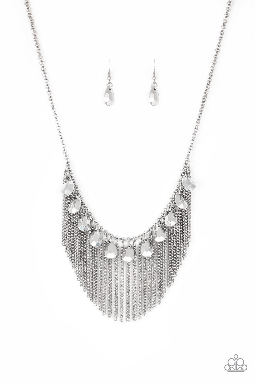 A row of faceted silver teardrops and free-falling silver chains drape below the collar, creating a dramatic fringe for a show-stopping style. Features an adjustable clasp closure.